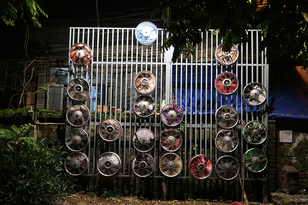 Trịnh Minh Tiến – VÒNG QUAY: Ký ức về cây cầu Long biên nơi những vòng xe đa chủng bươn bả vì cuộc sống. Bánh xe được nhặt từ phế thải gắn kết lại để con ngườicó thể tự tương tác trải nghiệm