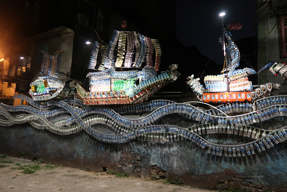Vũ Xuân Đông – THUYỀN: Tái hiện lịch sử của sông hồng xa xưa với giao thương phồn hội. Chất liệu được sử dụng lại chai nhựa, hộp dầu nhựa một loại phế thải gây ô nhiễm kinh hoàng cho dòng sông