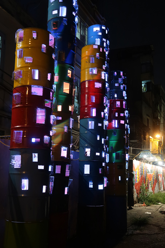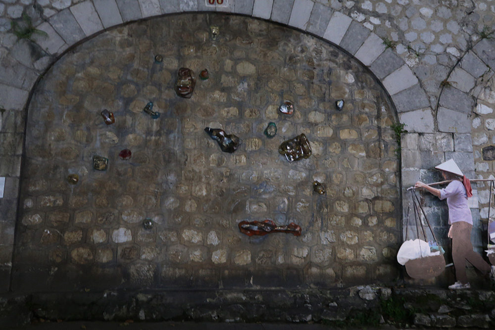 Nguyễn Hoài Giang – EMOJI CITY: Một thông điệp chào đón thiện mở của miền Phúc Tân, nơi còn đầy hoang sơ với môi trường cần bảo vệ quyết liệt. Tác phẩm được gép từ những viên gạch được đúc lại do những nắp chai nhựa thu gom nghiền nát