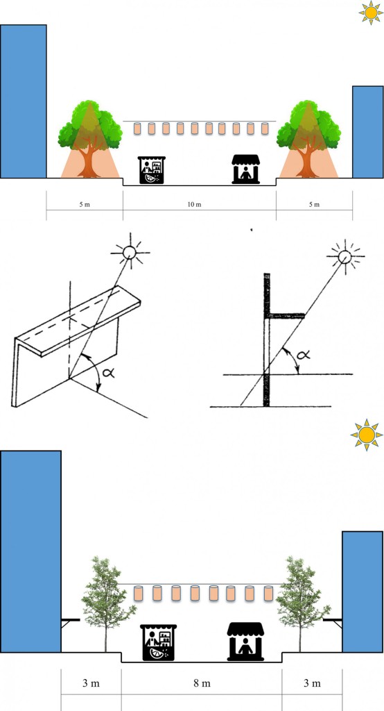 b. Tuyến phố có mặt cắt trung bình: Sử dụng các mái hiên di động với kích thước phù hợp từng tuyến phố. Thống nhất về màu sắc, chủng loại và cách bố trí. Với hướng nắng góc α = 60 độ, mái hiện di động hoặc cố định được bố trí như hình ảnh minh họa bên dưới.