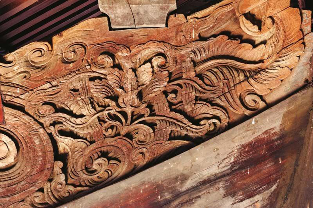 Trang trí bộ vì bằng đường nét chạm khắc thanh mảnh với chất liệu nền là gỗ mít.
