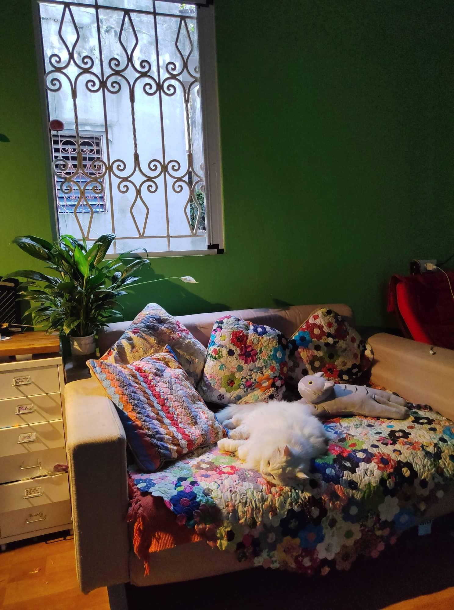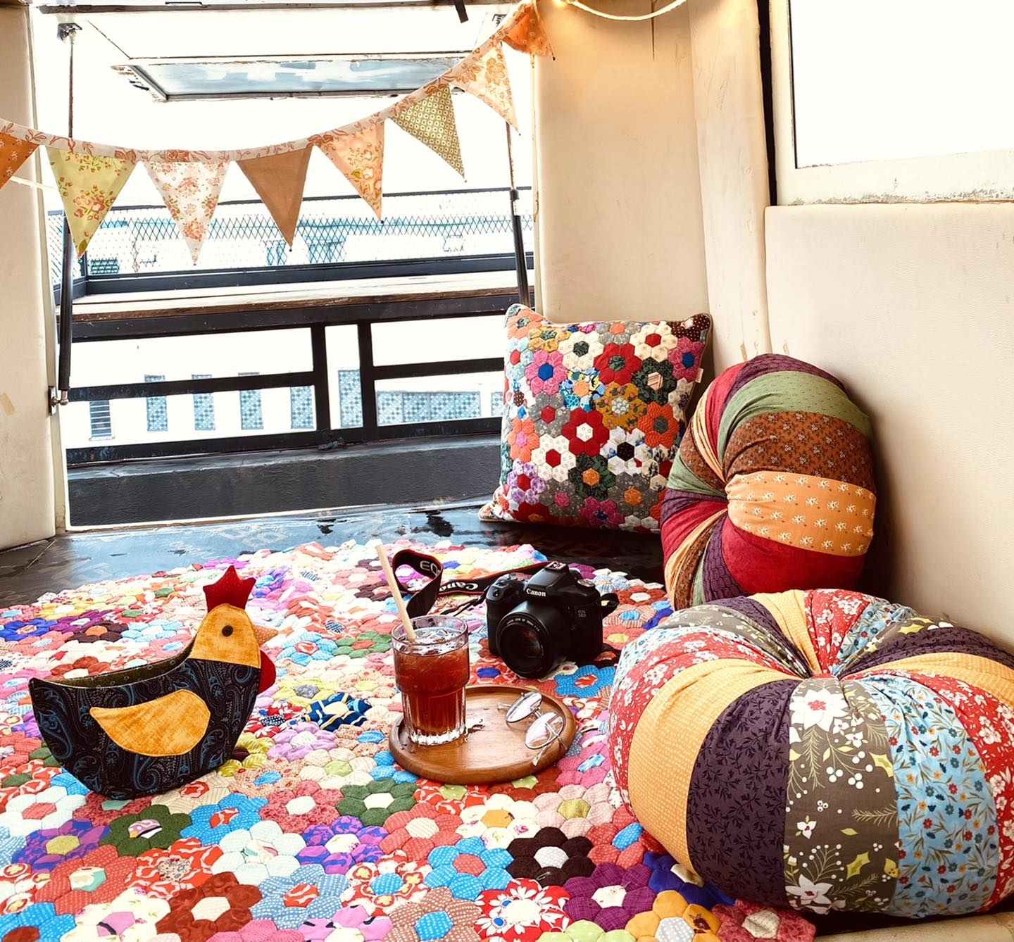 Không dừng lại ở đó, với sự sáng tạo của nghệ thuật ghép vải quilt thì những tấm rèm cửa đáng yêu, những miếng trải sofa đa dạng sắc màu và cả những tấm thảm trải sàn, những miếng lót ly, cốc… cũng đều là những ô màu nghệ thuật điểm xuyết trong không gian của căn nhà.