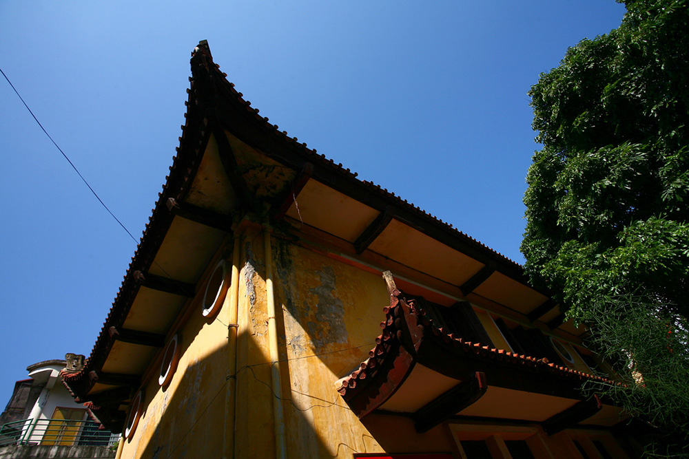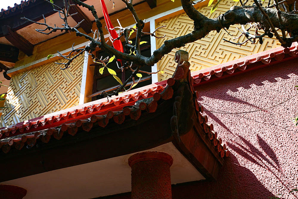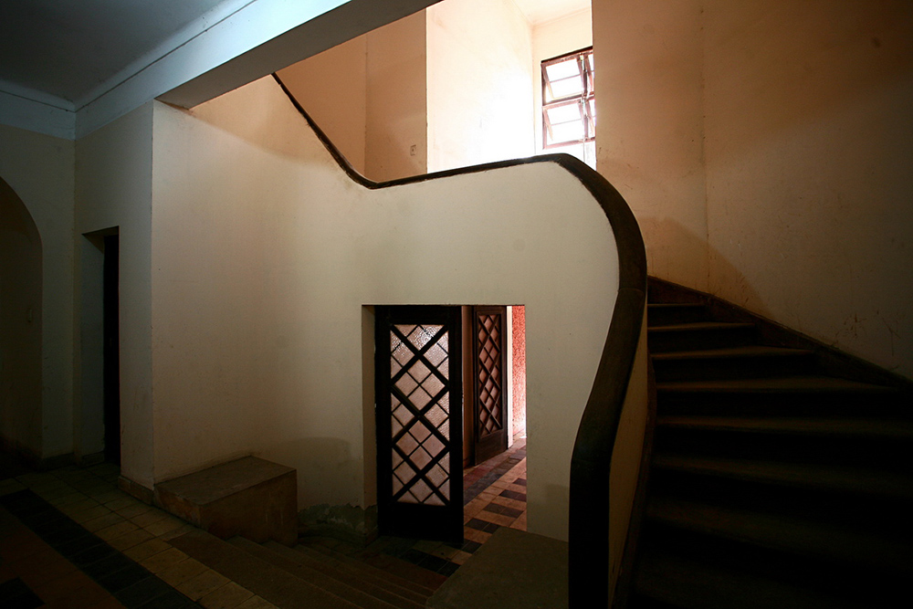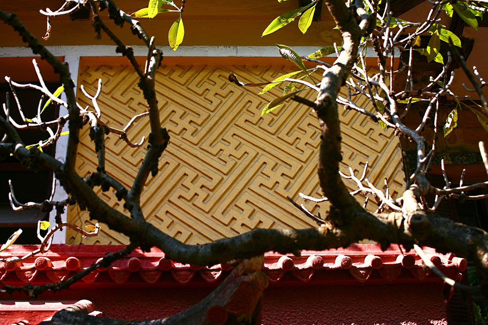 Mảng tường trang trí hoa văn hình chữ “Vạn”ở mặt tiền khối cầu thang