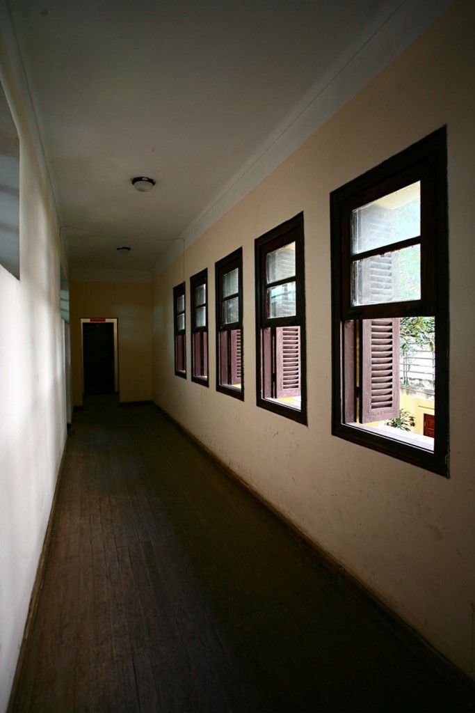 Hành lang bên được bố trí phía sau nhà, cũng có những ô cửa trong kính ngoài chớp
