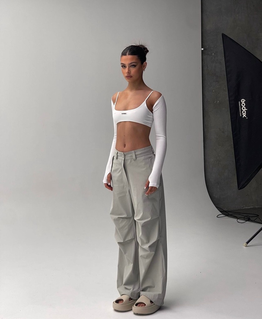Tuy mang dáng vẻ thô kệch và không mấy mềm mại nhưng quần vải dù hoàn toàn có thể giúp chị em trở nên quyến rũ và gợi cảm hơn, đặc biệt khi lựa chọn thiết kế cạp trễ và mix cùng áo cut out lệch vai.